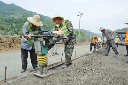11日,在大木厂镇十竹路施工现场,工人们头顶烈日艰苦奋战在项目一线,随着大型摊铺机缓缓驶过,一层层水泥稳定砂顺利“扎根”在大木厂镇的土地上,十竹路房县段正式进入路面工程。截至目前,十竹路房县段完成路基工程38.5公里,完成挖方225.5万立方米,填方28万立方米,沿线桥隧工程正掀起建设热潮,各工程难点节点也恢复正常施工,所有路基工程都将于本月底完工。(王东 摄)