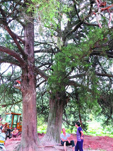 这两棵柏树长大后,下面的树干很直,上面的树枝很弯,一直拖到地面,像一把大伞为,不少百姓都喜欢在这两棵树下纳凉。在当地百姓的精心呵护下,这两棵柏树越长越茂盛,被当地人称作“神仙树”、“皇帝树”,许多有情人在这两棵树下喜结良缘。 (闵波 李露 摄)