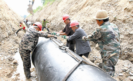日前,施工人员正在安装城区引水主管道,为县城自来水厂提供重要供水水源。连日来,县水利部门从马栏河张家湾段筑起一道拦河坝,安装标准化供水主管道,将清水引入县城自来水厂,该引水工程投入4000多万元,完成后可解决20万人饮水困难。