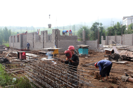 在精准扶贫易地搬迁工作中,城关镇从实际出发,结合集约土地、加快城镇化步伐、提高基础设施建设效益等要求,指导各村实施了易地扶贫搬迁集中上楼安置。右图为该镇八里村易地扶贫搬迁上楼安置小区建设现场,该小区可集中安置贫困户30户。 (王玮 薛花 摄)