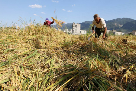 日前,城关镇白土村农民正在收割水稻(右图)。近5年来,全县累计完成投资1.5亿元,配套汪家河、谭家湾、关门山等六大万亩灌区节水渠道261.7公里,新修灌区防渗渠道264公里,通过完善和配套灌溉水利设施,全县新增与改善农田灌溉面积10.1万亩,为水稻丰产丰收打下坚实基础。 (张启龙 张华军 摄)