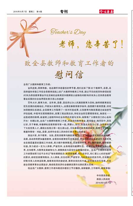 祝全县广大教师、教育工作者和离退休教职工节日愉快,身体健康,工作顺利,阖家幸福!