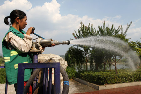 近日,县河道园林绿化技术人员正在浇灌城区河道沿岸树木、花草。我县7月以来持续高温干旱,全县干旱受灾人口17.3万人,农作物成灾面积19.6万亩,因大旱造成经济损失已达5000多万元。目前,我县采取分时、分片供水,运水车送水等措施,解困灾区群众饮水;同时,抢收水稻、玉米杂粮,补种蔬菜,确保减少农作物损失。(张启龙 摄)