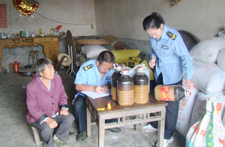 近日,中坝乡食药所接到一举报流动车出售伪劣食用油的电话后,立即到农户家中调查取证。在打击违法行为的同时,工作人员向群众宣传食品安全及维权常识,谨防其他人受骗。食药所负责人提示:一旦发现流动商贩售卖伪劣食品时,请立即拨打12331向食品药品监管部门报告。 (何玲玲 李蓉蓉 摄)