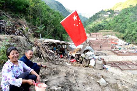 10月1日,姚坪乡观音沟村农民文寿山在自家过渡房前插上了一面鲜红的国旗。眺望山下由政府规划正加紧施工的移民小区,文寿山夫妇脸上露出幸福的微笑。