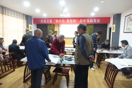 丹青书翰唐城萃,皓首听涛枫叶红。9日,县文艺界20多位资深书画爱好者齐聚房县听涛书画院开展了“枫叶红,重阳情”老年书画笔会活动。活动以“爱祖国、爱房县、爱人民”为主题,进行书画创作、交流创作心得、弘扬节日文化。