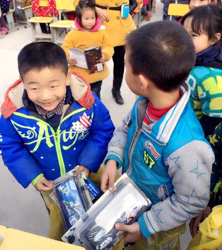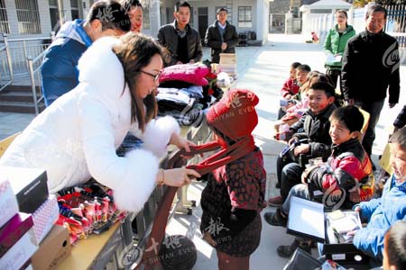 当天,爱心捐助团通过走访困难学生家庭、现场爱心结对、捐赠保暖衣物、捐赠助学金等方式,为困难家庭留守儿童送温暖,共捐赠钱物达13500元。其中九名爱心人士与困难学生结对,每年资助困难学生一千元现金,直到大学毕业。 (杜继征 摄)