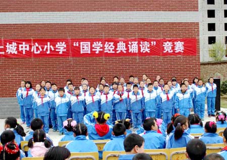 为弘扬传承优秀传统文化,自2010年2月至今,土城小学通过诵读国学经典打造学校特色文化,积极开展以“诵读国学经典,做有根的中国人”为主题的经典诵读活动,让国学经典进入校园、进入课堂,形成了校园处处见经典、师生人人诵诗文的生动局面。 (李伟 摄)