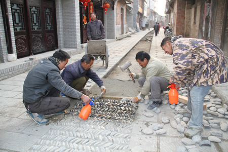 近日,工人师傅正在修复军店镇下店子村老街路面。下店子村是国家文物局、住建部等6部委命名 的“中国传统村落”。自2015年元月下店子传统村落保护性修复工程启动以来,在各方的不懈的工作下,一条画龙雕凤、青砖黑瓦、古色古香的明清老街已显雏形。(赵爱平 张德福 摄)