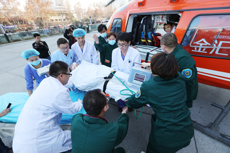 十堰市人民医院于去年6月被省卫生应急办认定为十堰唯一的直升机空中医疗救援基地医院,与上海金汇通航空公司签订了“空中救援”合作协议,去年8月30日成功进行了首次空中救援实战演习,此次救治活动是我市第一例120空中救援。