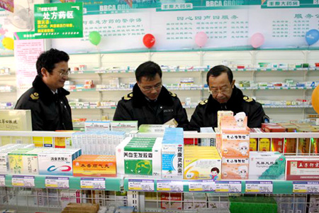 10日,县食品药品监管理局执法人员在药店检查药品质量。从去年12月中旬起,县食药局在全县范围内开展食品药品安全整治专项行动,主要针对节日热销食品等消费特点,加大重点食品、重点领域的监督检查力度,确保春节期间食品药品市场安全。(李绍龙 摄)