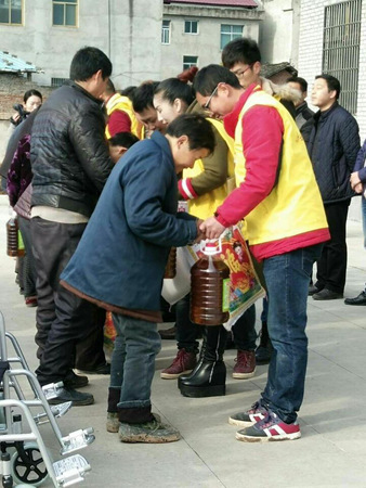 在军马村村委会门前,活动赞助商—房县圣硕农业有限公司总经理陈伟,和志愿者们一起把2台轮椅、10床棉被、11份大米和食用油,以及近百双棉袜、手套和护耳套,分别送到贫困户的手中,一些接受捐赠的老人拉着志愿者的手连声道谢。志愿者们还来到瘫痪低保户任志普和黄梅英的家中,询问他们的病情,为他们送去轮椅,并叮嘱他们要保重身体,坚强乐观。