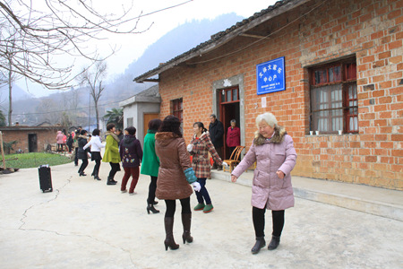 回龙乡红旗村“文体大家乐中心户”杨大妈在自家院落教授广场舞