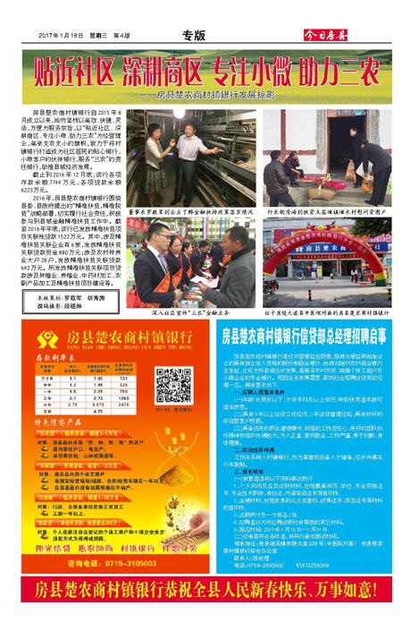 房县楚农商村镇银行自2015年8月成立以来,始终坚持以高效、快捷、灵活,方便为服务宗旨,以“贴近社区、 深耕商区、专注小微、助力三农”为经营理念,高举支农支小的旗帜,致力于将村镇银行打造成为社区居民的贴心银行,小微客户的伙伴银行,服务“三农”的责任银行,助推县域经济发展。
