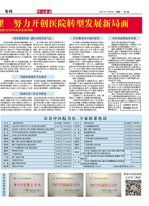 住院综合楼投入使用。住院综合楼项目历经两年多的建设,于2016年4月投入使用,集针灸推拿康复、体检中心(治未病中心)、心血管科、制剂、行政办公、职工食堂为一体,服务功能日趋完善。配套项目顺利推进。消毒供应中心、内窥镜中心、医疗废物暂存间投入使用;脑病科独立成科;心血管科、风湿病科、制剂室、眼耳鼻喉科、口腔科顺利转址。