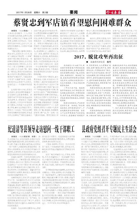 本报讯 (记者吴宏强 刘臣) 25日,县委副书记、县长纪道清,县委副书记王家波带着新春的问候,分别来到县公安局、环卫所、供电公司、慧泉水业等地,走访慰问一线干部职工,向他们致以新春的祝福。县政协主席徐锦凤,县人大常委会常务副主任高明哲,县委常委、常务副县长肖大有,县政府党组成员熊祖友分别参加慰问活动。