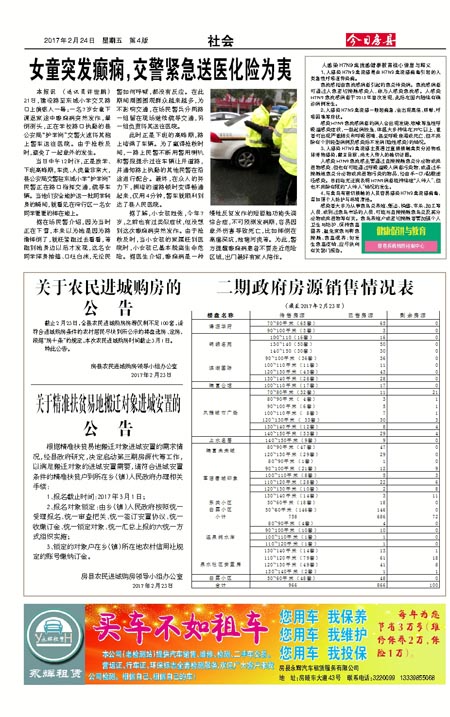 本报讯 (通讯员许世鹏) 21日,建设路至东城小学交叉路口上演感人一幕:一名7岁女童下课返家途中癫痫病突然发作,晕倒街头,正在学校路口执勤的县公安局“护学岗”交警火速将其抱上警车送往医院。由于抢救及时,避免了一起意外的发生。