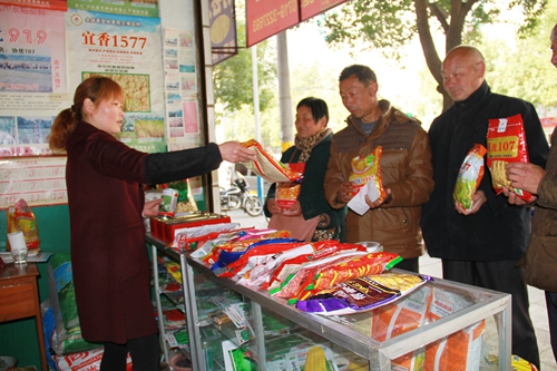 红塔镇五龙村二组农民郭长合等村民在县农业局种子公司门市部购买良种。(赵爱平 刘伟 摄)