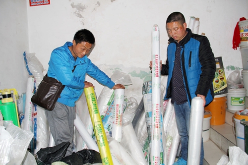 青峰镇卧牛观村村民陈务军和同伴一起在农资专卖店购买地膜。(赵爱平 张俊 摄)