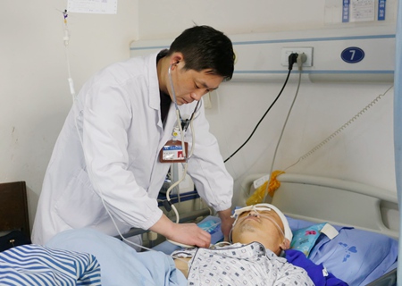 图为神经外科主任李德龙为动脉瘤患者做术后检查