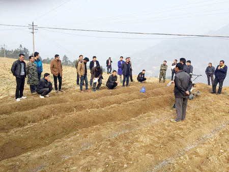 烟站技术人员对烟叶春季种植技术和农具使用方法做了详细的讲解。烟农就相关步骤进行了认真的观摩和实际操作。(桂培培 马正文刘伟 摄)