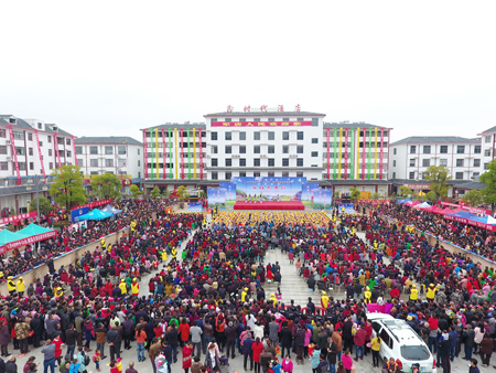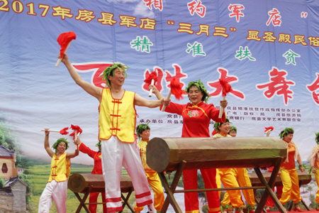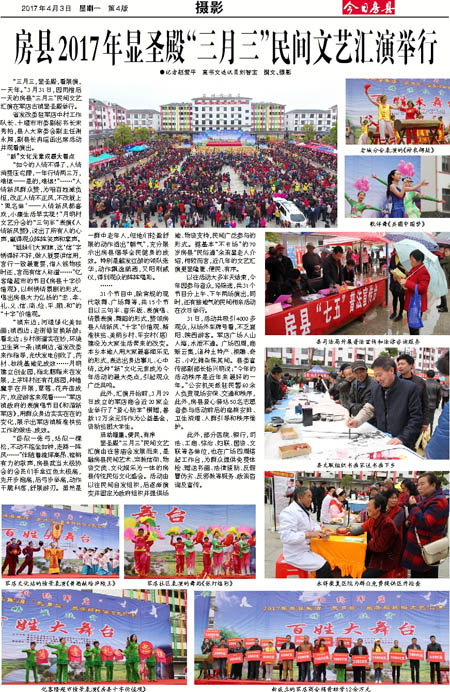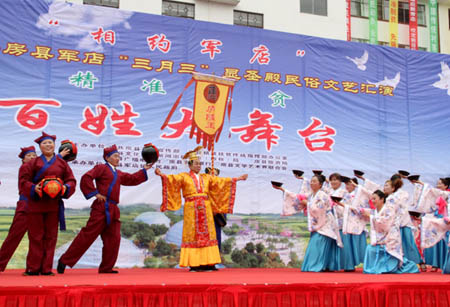 “三月三,显圣殿,看展演,一天年。”3月31日,因雨推后一天的房县“三月三”民间文艺汇演在军店古镇显圣殿举行。