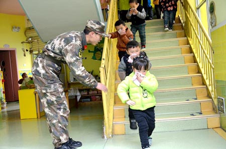 本报讯 (通讯员李绪鸿) 日前,县幼儿园开展消防安全教育活动。伴随着警报声,消防紧急疏散演练开始了,全体幼儿迅速地拿取湿毛巾,捂住口鼻,有序地向操场空地疏散(如图)。