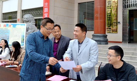 22日,县国土资源局工作人员正在向群众宣传保护地球知识。第48个世界地球日来临之际,县国土资源局组织工作人员,通过设立咨询台、悬挂标语方式,以国土保护为主题,向群众宣传国土资源国情国策、节约集约利用土地,倡导绿色简约生活。活动当天发放宣传资料500余份。(陈涛 摄)