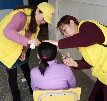 一大早,志愿者们就来到了学校,在老师的陪同帮助下,大家为学生们整理了被子、清理了环境卫生,为孩子们理发整型,并为一名9岁的自闭症儿童做了心理疏导,鼓励她树立信心,好好学习。整个上午,孩子们都沉浸在欢乐陪伴的海洋里。(华新 摄)