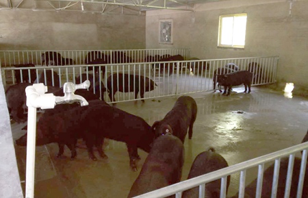 4月27日,军店镇指北村康生态养殖农民专业合作社养殖的秦巴黑母猪长势良好(右图)。该合作社从江西引进秦巴黑母猪120头、种猪3头,可年产猪仔2500头,以合作社的形式引导全村农户报团发展生态养殖,带动贫困户脱贫。(崔天虎 摄)