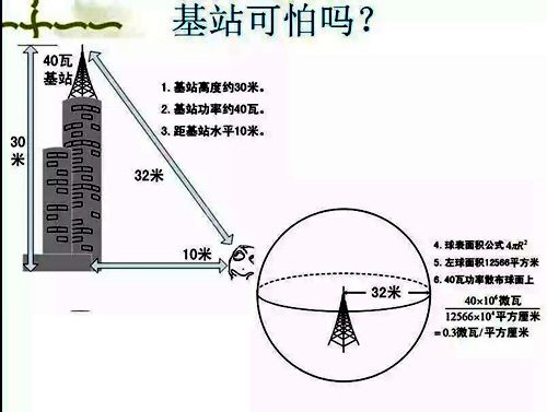 而基站这个东西是建的很高大的,和人的距离相当于远。辐射强度很小,远没有人们想象的得那么大。据实测,一栋与基站的直线距离约200米的居民楼,检测人员用综合场强仪检测磁场辐射值。经过检测,该居民楼的磁 场辐射平均值为0.38微瓦/平方厘米。一栋离基站直线距离约100米的居民楼,辐射值为0.41微瓦/平方厘米。基站安装顶楼住户家的辐射值为0.31微瓦/平方厘米。