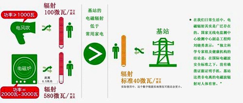 对比家用的无线路由器,一般都有20多微瓦/平方厘米。手机待机时,一般也有17微瓦/平方厘米。可以看出,手机、无线路由器的辐射就远高于基站。