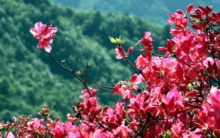 就在这迟暮晚钟声中,好像春花已在向人们谢幕收场了,没有,好戏还在后头呢!在众目睽睽之下,几声杜鹃鸟的催鸣,那满山的杜鹃花紧锣密鼓的唱开了。他们显摆着、坚守着春光春色,把春天这场戏演绎得正出彩正完美呢!