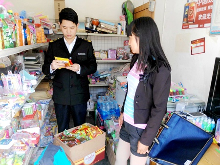 近日,尹吉甫镇食药监管所执法人员对辖区内校园及周边的“五毛食品”进行专项检查(如图)。为保障广大学生食品消费安全和身体健康,县食药监局针对“五毛食品”,组织各乡镇监管所对辖区内中小学校、幼儿园、周边食品经营户、流动小摊贩及批发部进行清理、整顿,对抽检不合格的食品,严格按照相关法律、法规依法处理,切实构建校园食品安全屏障。 (李炯 摄)
