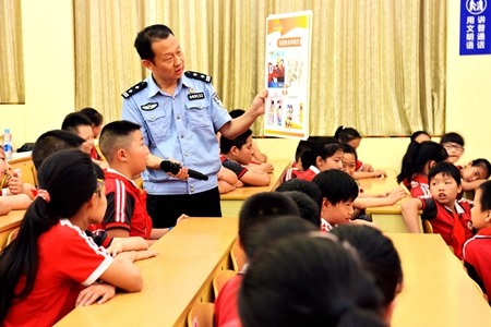 近日,城关派出所民警正在县实验小学为学生上暑期安全教育课。暑期即将来临,为了确保学生平安度假,县公安局基层派出所民警到辖区中小学校上安全教育课,教育引导学生提高自我保护意识,强化防溺水、防触电、防交通事故能力,让孩子们远离危险快乐度假。(魏世银 杜德仕 摄)
