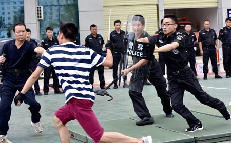 24日上午,县公安局城关派出所民警正在进行涉校突发事件处置演练。为确保秋季学校顺利开学,县公安局未雨绸缪,在做好社会治安防控、矛盾排查化解的同时,模拟各种环境下突发事件的处置,确保学校和学生安全。