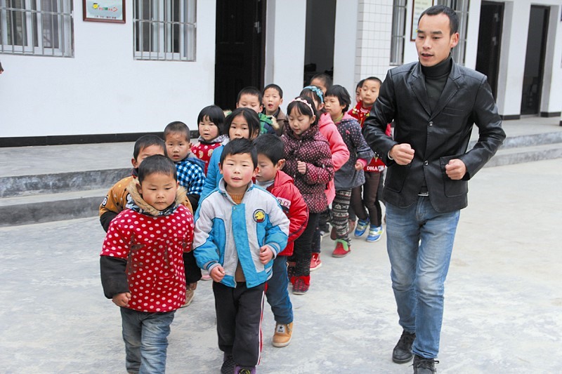 ▲ 课间活动时间,毕业于云南大学/32岁的卢俊带领孩子们跑步、做游戏。