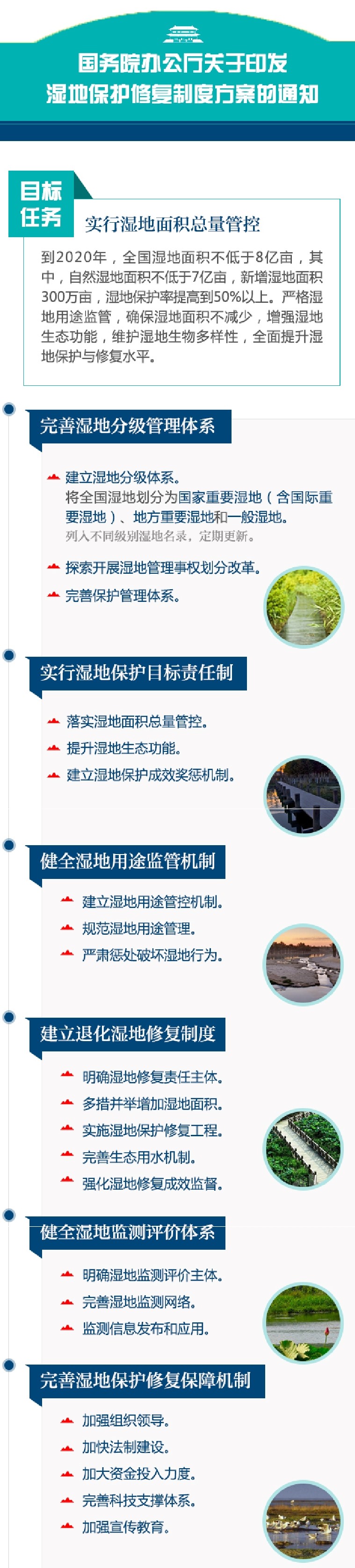 2016年11月30日,国务院办公厅印发《湿地保护修复制度方案》(国办发〔2016〕89号),这是我国生态文明体制改革的全新成果,为完善湿地保护管理制度体系奠定良好基础。