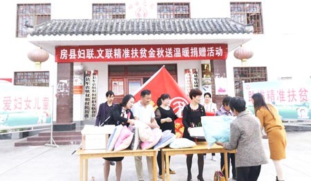 21日,县妇联、文联组织干部职工来到军店镇双柏村开展精准扶贫金秋送温暖活动,以实际行动贯彻落实县委“八个一”指示精神。县妇联为贫困户送上新衣600多件;文联送上系列房陵文化丛书。文艺志愿者还为农户现场书写了书法作品。(张立林 摄)