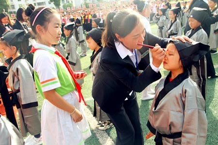 本报讯 (通讯员李英) 9月28日,东城小学举行以“开蒙启智,为人生幸福奠定基础”为主题的2017年开笔礼仪式,120名一年级新生身着汉服,先后进行“齐正衣冠”、“朱砂启智”、“击鼓明智”、“启蒙描红”、“诵读经典”、“鞠躬感恩”、“瞻仰圣人”、“集体宣誓”等礼仪,亲身体验了“人生第一大礼”——开笔礼,开启了他们人生求学的第一课。