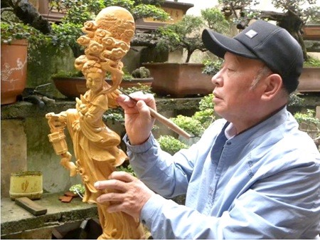 房县木雕大师谭荣志从小受到《嫦娥奔月》的神话故事影响,赶在今年中秋之际,他用珍贵黄杨木雕刻出一件中秋主题作品——“嫦娥奔月”。作品历时半年。木雕嫦娥面目秀丽,身材窈窕,仙袂飘飘,手提宫灯,怀抱玉兔,回望大地故乡,其头顶祥云缱绻,月宫隐约可见。整件作品细腻传神,气息高雅,是一件不可多得的木雕精品。 (余策星 摄)