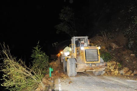 20日晚间20时10分左右,209国道苏北线野人谷镇谭家湾村二组(谭家湾水库)K231+709处山体滑坡造通中断,初步统计方量约3528立方米,滑坡体造成钢护栏损毁32米,路基损毁32米,交通中断(上图)。险情发生后,县公路局迅速组织人员机械进行抢通,并对过往司乘人员进行交通疏导。经过3小时艰苦奋战,该路段于夜间11时5分恢复半幅通行,21日凌晨1时40分全幅畅通。 (王东 刘志军 摄)