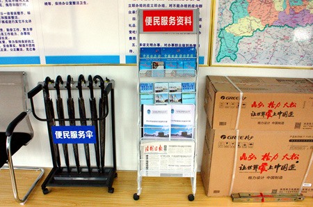 ▲ 饮水机、微波炉、空调、冰箱、桌椅、充电插座、应急药箱、书报架、雨伞等设施一应俱全。