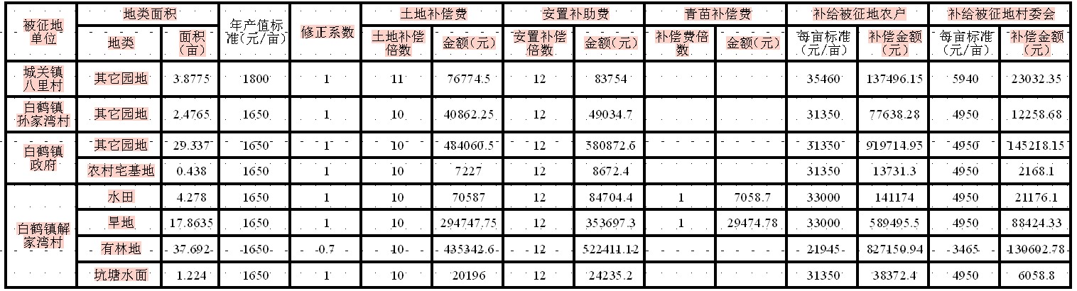 4、征收面积:被征收土地总面积6.4791公顷(折合97.1865亩),其中:城关镇八里村0.2585公顷(折合3.8775亩),白鹤镇孙家湾村0.1651公顷(折合2.4765亩),白鹤镇解家湾村4.0705公顷(折合61.0575亩),白鹤镇政府1.985公顷(折合29.775亩),详细分类面积见下表。