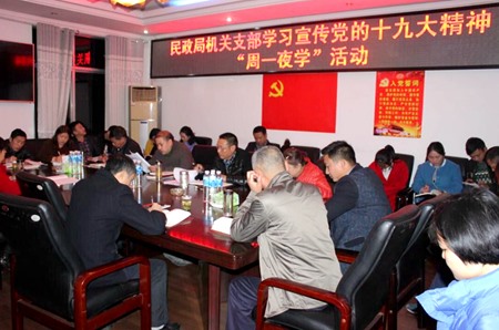 27日晚7点,县民政局机关支部组织全体干部职工认真开展学习宣传党的十九大精神“周一夜学”活动。连日来,全县各乡镇、各部门兴起学习宣传贯彻十九大精神热潮,通过道德讲堂、理论学习中心组、“周一夜学”等平台载体,充分运用集中学习、精读文件、专题研讨、基层宣讲等各类形式,提高十九大精神宣传覆盖面和实际效果。