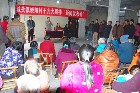 1日上午,城关镇晓阳村举行十九大精神“新闻发布会”,镇党委书记林云国担任“新闻发言人”,他用接地气的语言、鲜活的例子,向村民们宣讲党的十九大精神。晓阳村党支部书记丁文宝说:“聆听了十九大精神‘新闻发布会’,群众吃下了‘定心丸’,村干部有了‘尚方宝剑’,接下来一定要认真带头学习十九大精神,向身边群众讲清楚党中央现阶段的‘三农’政策,将党的惠民富民政策落实到农户。” (柯勇 摄)