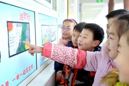 近日,走在县实验小学校园内,随处可见学生们欣赏着、议论着“诗配画”作品,校园里到处都洋溢着浓浓的读经典、诵经典气息。最近一周是该校“诗配画”展示周,同学们把自己精心绘制、充满诗情画意的作品在各班宣传栏展出。据了解,12月是该校经典诵读展示月,学校通过诵经典(朗读比赛)、绘经典(诗配画)、用经典(征文比赛),以及微视频比赛等形式,多角度展示活动成果,将经典诵读活动推向高潮。 (陆晓月 摄)