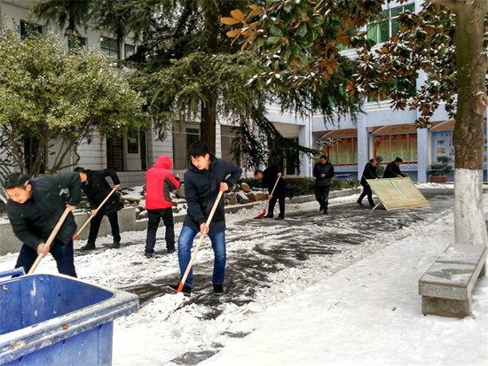 为了保障学生安全,1月25日上午,县一中教师积极行动起来,利用暂时无课时间,冒严寒,顶风雪,扫雪铲冰,清理出一条条安全通道,为学生在校学习生活安全提供了保障。(高英 摄)