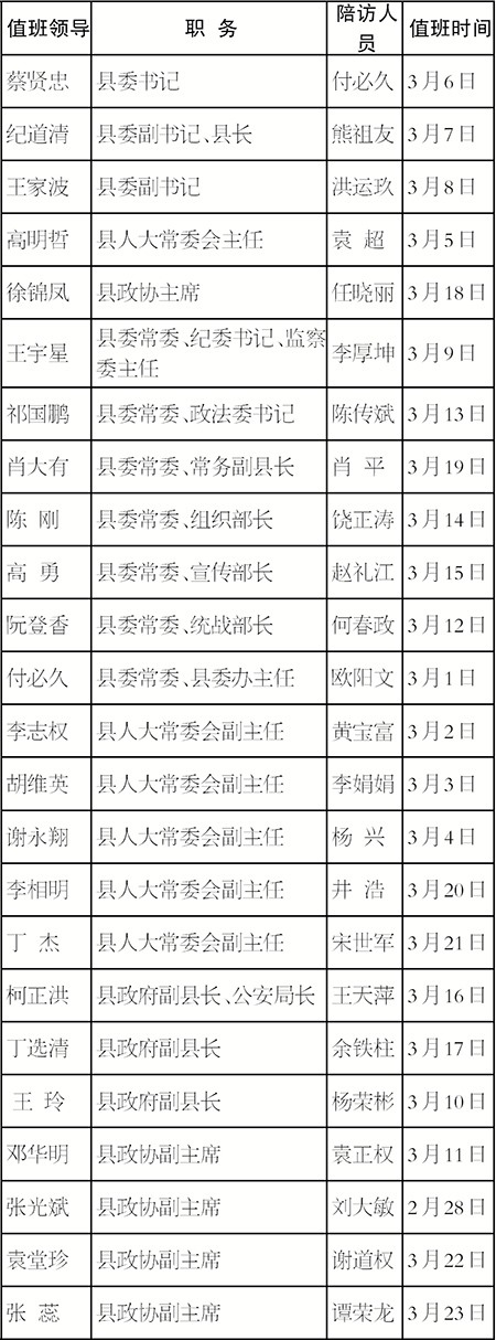 根据省、市和县委、县政府关于近期县乡领导做好开门大接访的有关要求,县集处领导小组对即日起至3月23日县领导值班接访进行了安排。值班领导要提前做好准备,严格按时到县群众来访接待中心值班接访,现场接待群众,协调处置当日发生的突发性群体性事件。如果有特殊情况不能到岗,请值班领导自行协商其他领导调换班次,并向县委、县政府主要领导报告。具体安排如下: