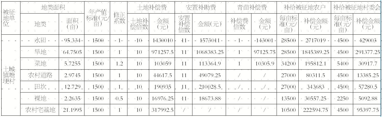 根据房县征地统一年产值标准,土城镇属Ⅲ地区,年产值标准为1500元/亩。具体补偿标准和数额见上表。